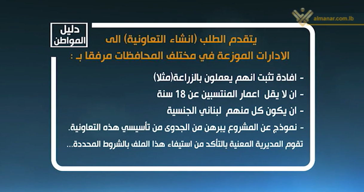يهدف إنشاء التعاونيات لتحسين اوضاع اعضائها اقتصاديا واجتماعيا اضافة الى تضافر الجهود والخبرات لزيادة الدخل من خلال زيادة الانتاج وتحسين جودته وتخفيض التكاليف .. ما هي الشروط المطلوبة لانشاء التعاونيات، مع مدير عام التعاونية في وزارة الزراعة غلوريا ابو زيد..
