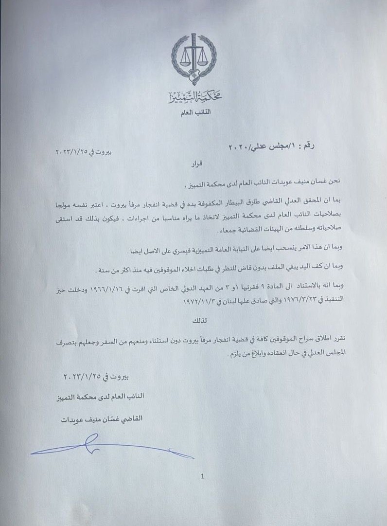 تفاصيل قرار مدعي عام التمييز القاضي غسان عويدات باخلاء سبيل جميع موقوفي ملف انفجار المرفأ.