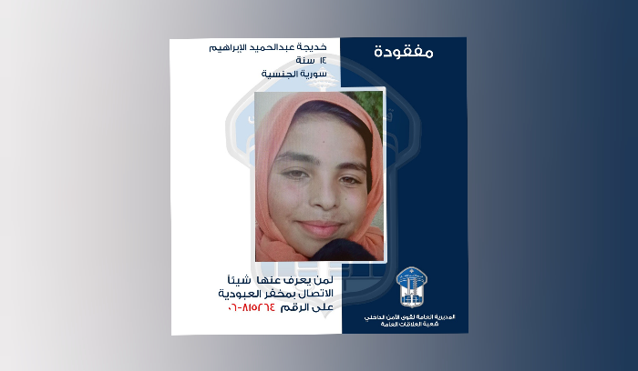 صدر عن المديرية العامة لقوى الأمن الداخلي- شعبة العلاقات العامة، البلاغ التالي: “تعمم المديرية العامة لقوى الأمن الداخلي بناء على إشارة القضاء المختص صورة المفقودة القاصر: خديجة عبد الحميد الإبراهيم (مواليد عام 2009، سورية) التي غادرت بتاريخ 27/06/2023 منزل ذويها الكائن في بلدة تلحميرة- عكار ولم تعد لغاية تاريخه.
