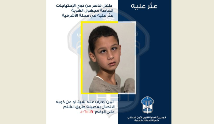 “تعمم المديرية العامة لقوى الأمن الداخلي بناءً على إشارة القضاء المختصّ، صورة طفل قاصر مجهول الهوية، عثر عليه بتاريخ 3-10-2023 في محلة الاشرفية – جادة بيار الجميل بالقرب من مصرف الـ “BLC”، وهو من ذوي الاحتياجات الخاصة وغير قادر على النطق ولا على تحديد مكان إقامته، وليس في حوزته أي مستند يعرف عنه.