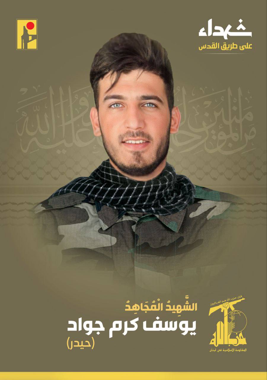 المقاومة الإسلامية تزف الشهيد المجاهد يوسف كرم جواد “حيدر” من بلدة عيتا الشعب والذي ارتقى شهيداً على طريق القدس