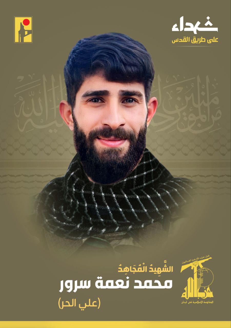 المقاومة الإسلامية تزف الشهيد المجاهد محمد نعمة سرور “علي الحر” من بلدة عيتا الشعب الذي ارتقى شهيداً على طريق القدس