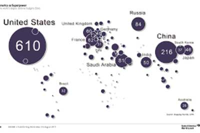 ويبلغ حجم الانفاق العسكري للولايات المتحدة ثلاثة اضعاف حجم انفاق الصين التي احتلت المركز الثاني في القائمة بإنفاق قدره 215 مليار دولار في عام 2016 . وجاءت روسيا في المركز الثالث، بفضل اندفاع غير متوقع نحو الإنفاق العسكري. وساعد ذلك روسيا على احتلال المركز الثالث بدلا من المملكة العربية السعودية، التي شهدت انخفاضا في الإنفاق، لتضرر اقتصادها جراء تراجع أسعار النفط على الأرجح.