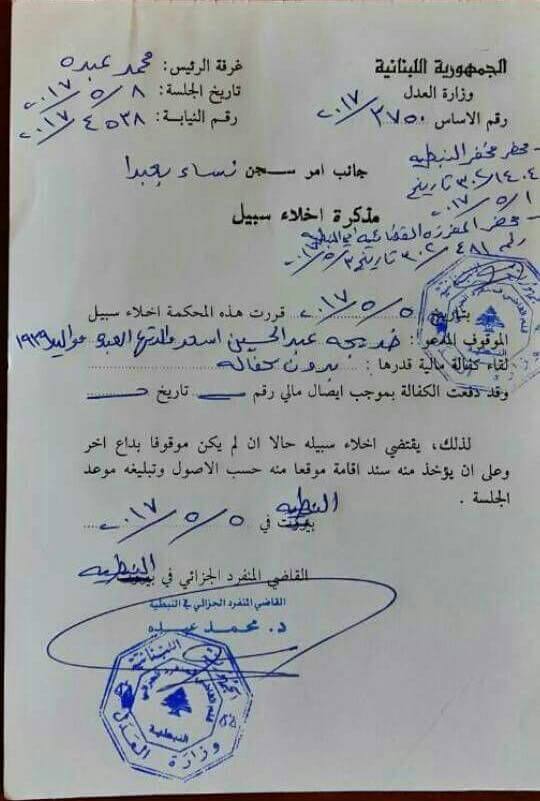 إخلاء سبيل الموقوفة خديجة اسعد بعد توقيف دام خمسة ايام في مخفر درك الدوير، وكانت نقلت اليوم الى سجن بعبدا.
