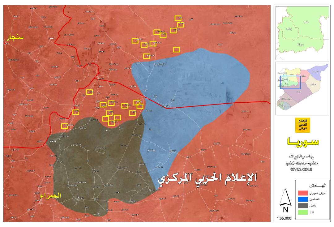 وضعية تظهر متابعة الجيش السوري وحلفائه عملياتهم في الجيب المحاصر بارياف حلب وحماه وادلب المتداخلين فيما بينهم والسيطرة على قرى” جنينة – جب السكر – الحنين – الخطابية – ابو محالة – جب الحنطة – القناطر – جديدة – ابو حبايا – مرامي بني هلال – ام زحيمك – البيضة – فيضة – متوسطية – عقلة – مشيرفة – مكسر الشرقي – ابو القناة – ابو صوايا قلعة الحوايس” بعد مواجهات مع المجموعات المسلحة المنتشرة في المنطقة.