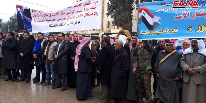شهدت مدينة الحسكة اليوم تجمعاً شعبياً حاشداً لشيوخ ووجهاء القبائل والعشائر والفعاليات كافة وذلك في ساحة السيد الرئيس للتنديد بالتهديدات التركية بشن عدوان على الأراضي السورية ورفضاً لأي وجود أجنبي غير شرعي فيها.