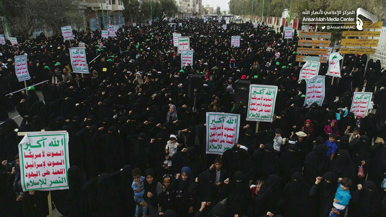 خرجت الآلاف من المواطنات اليمنيات في العاصمة صنعاء في مسيرة تحت شعار “العدوان ينتقم من حجور” تنديداً بـ مجزرة طلان كشر بحجة التي ارتكبها طيران العدوان السعودي الأمريكي ليل الأحد الماضي وراح ضحيتها 43 شهيدًا وجريحًا جميعهم نساء وأطفال. وافتتحت المسيرة بآي من الذكر الحكيم، ومن ثم النشيد الوطني وكلمة ألقتها وجدان الوظاف إحدى نازحات محافظة حجة.