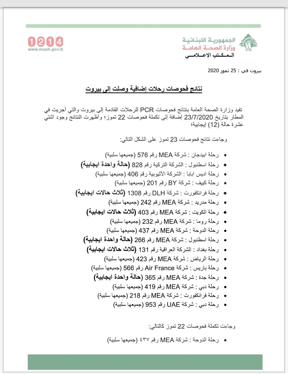 أعلنت وزارة الصحة العامة نتائج فحوص PCR للرحلات القادمة إلى بيروت والتي أجريت في المطار بتاريخ 23/7/2020 إضافة إلى تكملة فحوص 22 تموز؛ وأظهرت النتائج وجود اثنتي عشرة حالة (12) إيجابية؛
