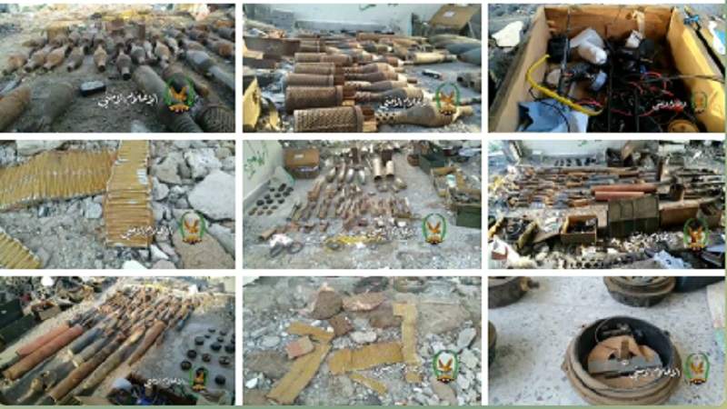 وذكر أنه” تم العثور على مخزن ومعمل لتجهيز العبوات والأحزمة الناسفة يحتوي على 15 لغم أرضي، و9 عبوات متفجرة فردية، و151 قذيفة متنوعة كانت جميعها معدة لاستخدامها كعبوات ناسفة، و15 قالب عبوات ناسفة، وكمية من الدوائر الكهربائية التي تستخدم في عمليات تفجير العبوات الناسفة، كما تم العثور على أحزمة ناسفة، وقنابل يدوية”.